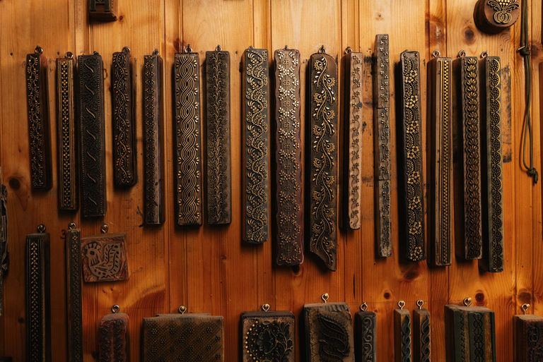 Solche, mit glatter Druckfläche zum Auftragen der Farben, sowie die Mustermodel, wahre Kunstwerke aus Holz, entweder geschnitzt, oder mit eingeschlagenen Messingstiften, die das eigentliche Muster ergeben.